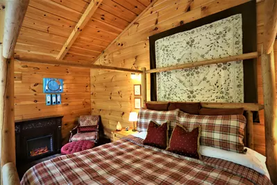 Share quiet mornings on the deck with mountain views, then unwind together in the private hot tub under the stars. Inside, the spacious king suite invites romance with a cozy fireplace, in-room Jacuzzi, and a spa-inspired stone shower. The warm glow of the fire, soaring ceilings, and thoughtful touches throughout create an atmosphere made for love and connection.