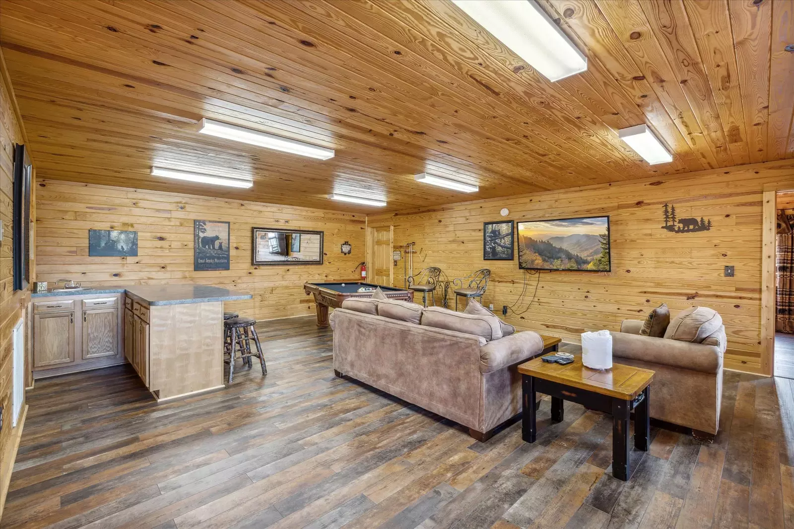 The ground level features a 2nd living space, wet bar and dining table, a washer and dryer, game room, a queen bedroom with private bathroom, and a full bedroom.